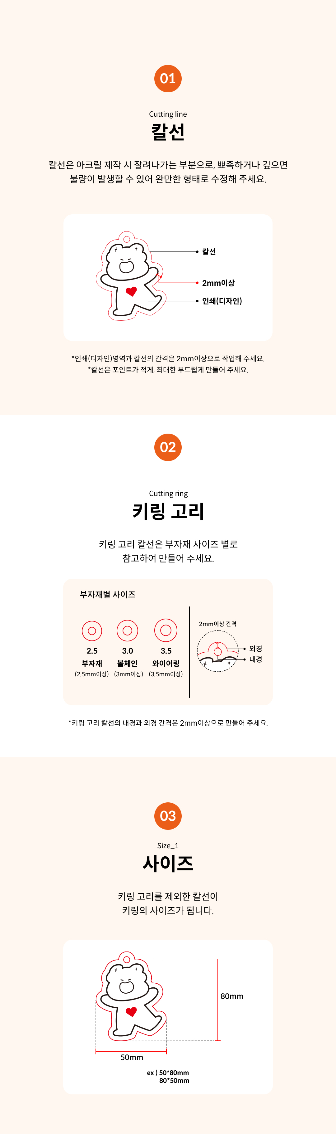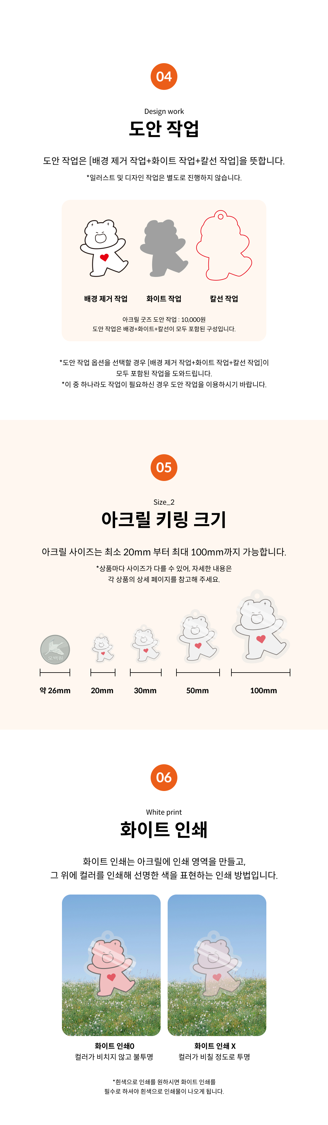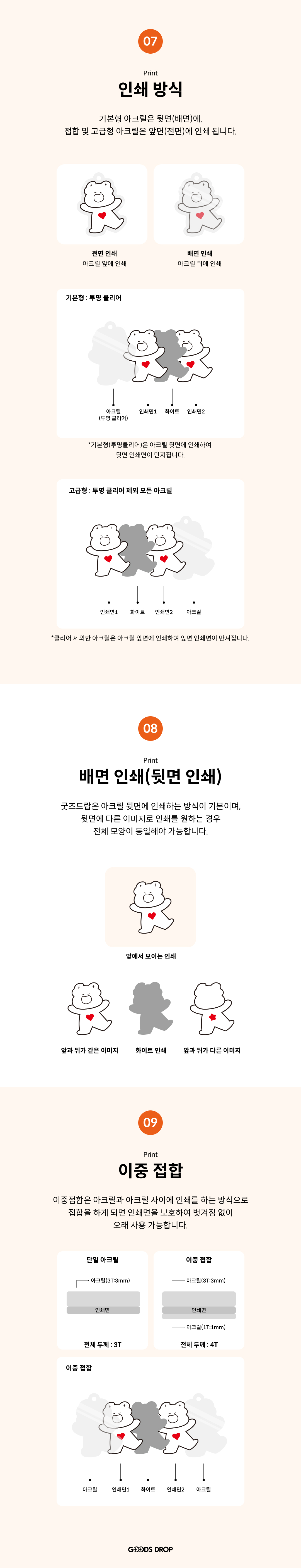 앞뒤가 보이는 아크릴의 경우 : 앞뒤의 인쇄물이 같은지 다른지 선택해주세요 / 불투명 아크릴의 경우 : 단면인쇄